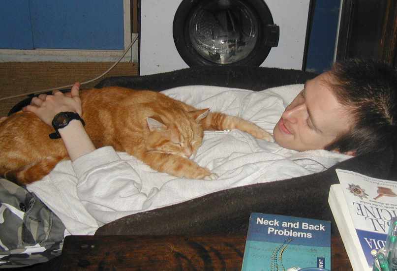 Panda relaxes on Robin (note Robin's great posture and choice of reading material)